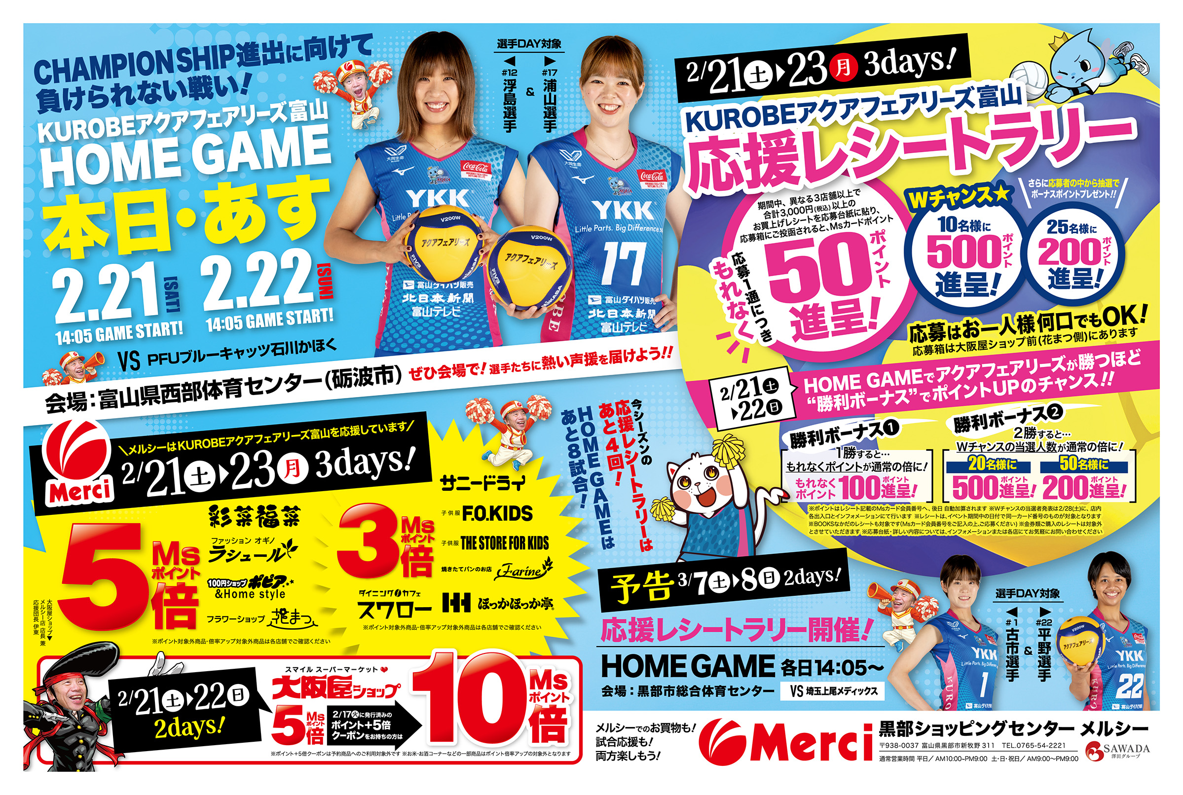 2月21日~23日『KUROBEアクアフェアリーズ富山 応援レシートラリー』
