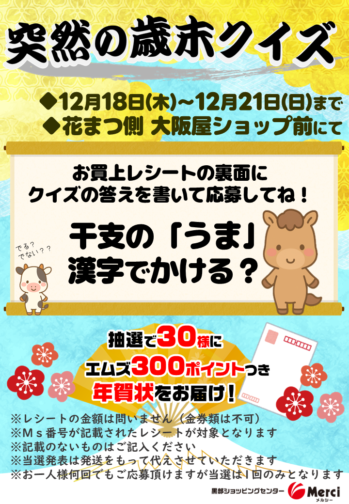 正解者の中から抽選で30名様に300エムズポイント(自動加算)とメルシーから年賀状が届きます。