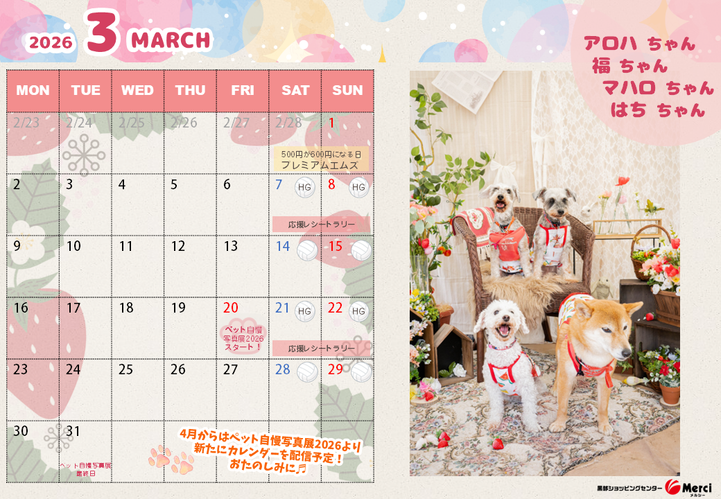 3月のペットカレンダー・催事カレンダーができました! ただいま『わが家のペット自慢写真展』応募受付中です