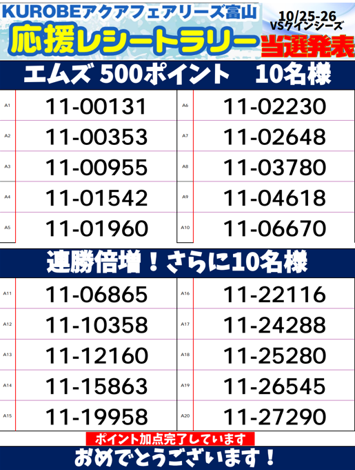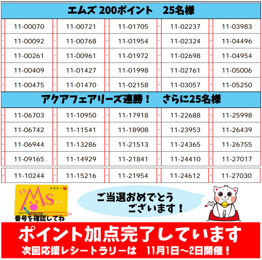 10/25~10/26開催『アクア応援レシートラリー』当選発表